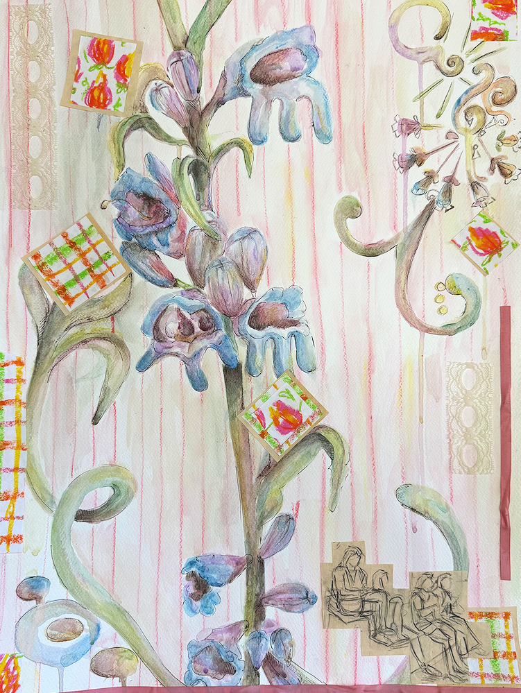 WATERCOLOR AND COLORED PENCIL ON PAPER WITH COLLAGE ELEMENTS